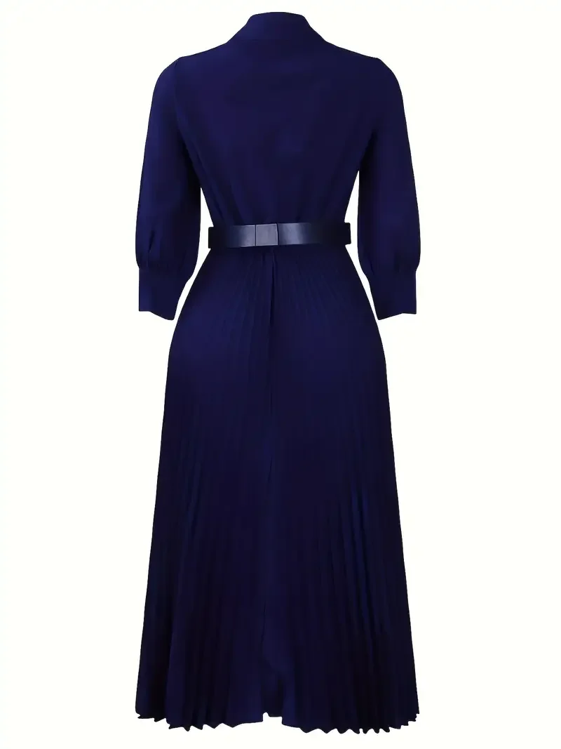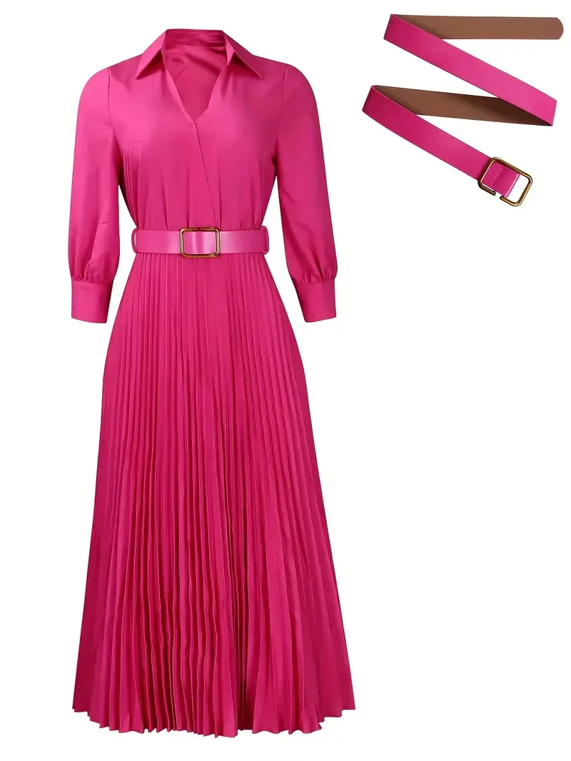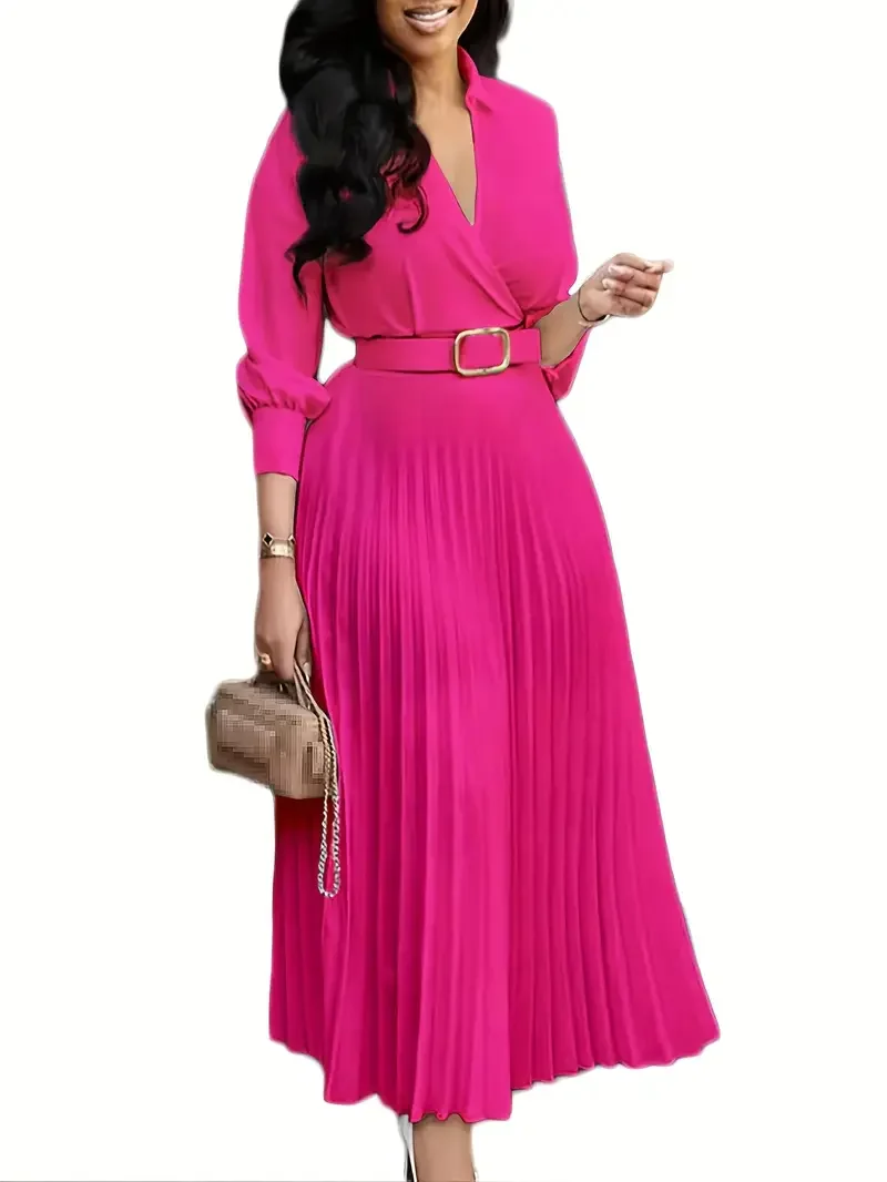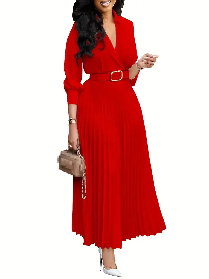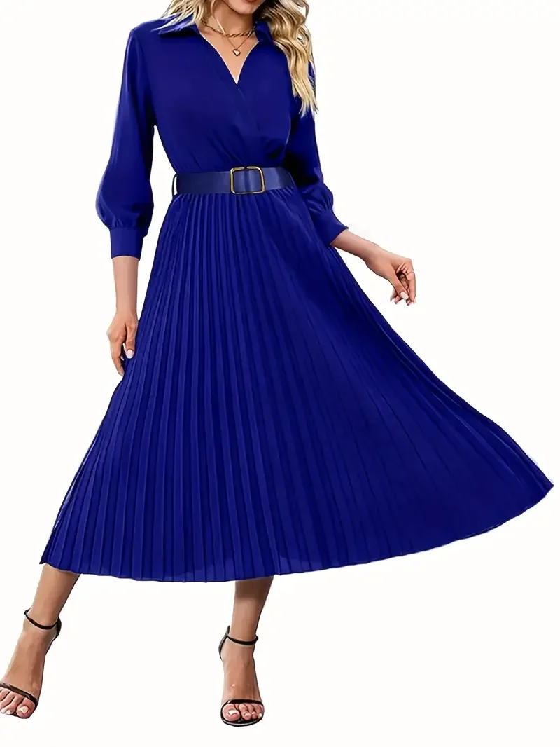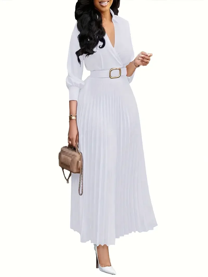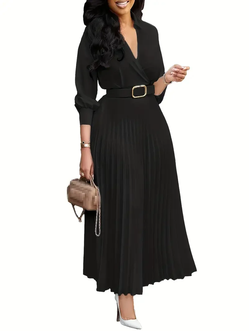 Elegant Pleated Maxi Dress for Office Women with Lapel and Long Sleeves for Casual Wear