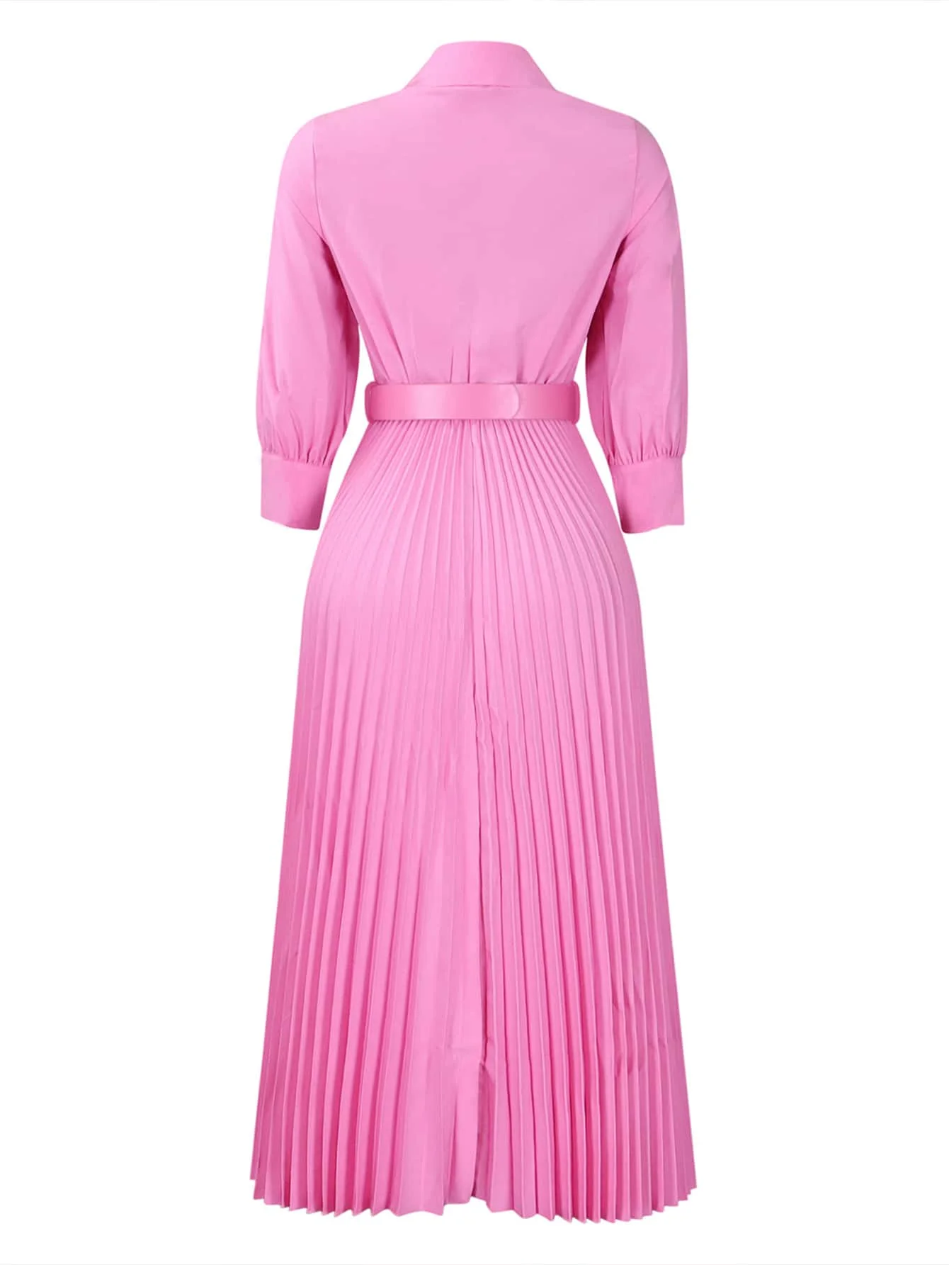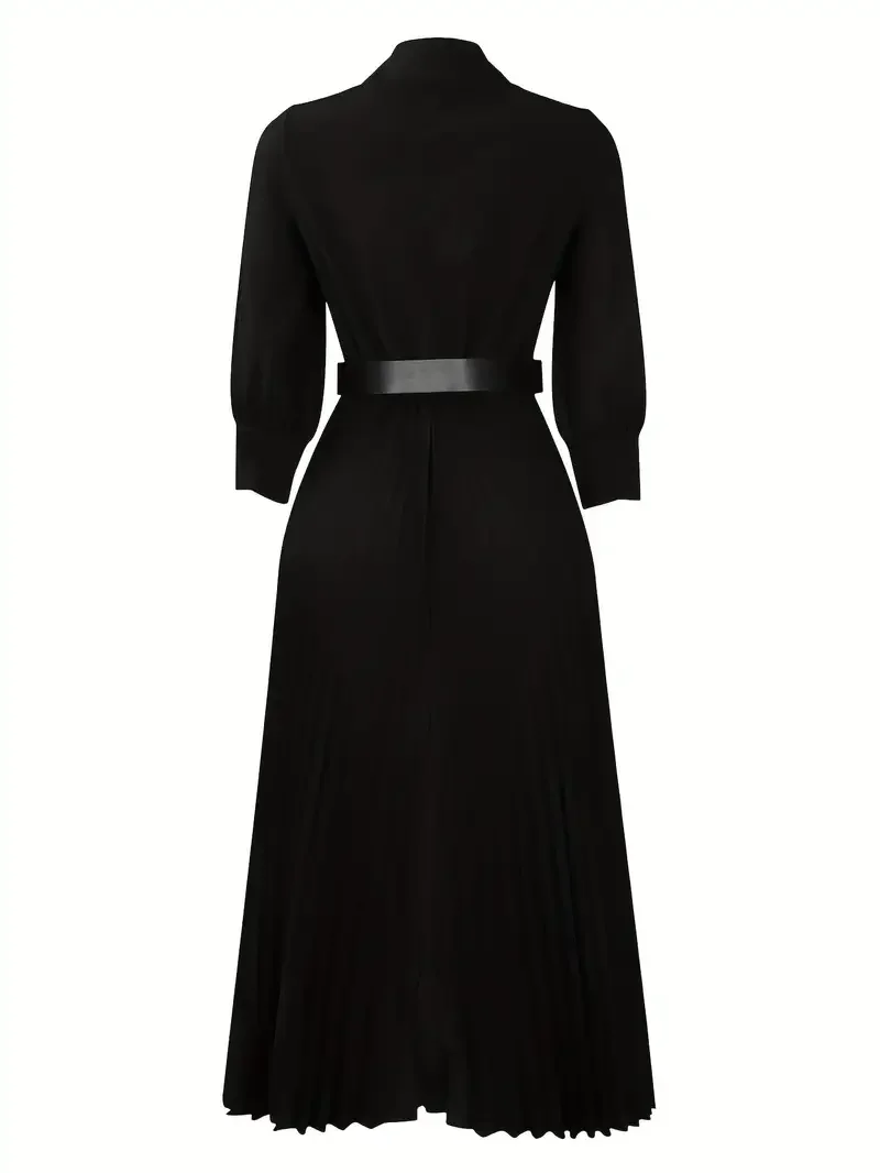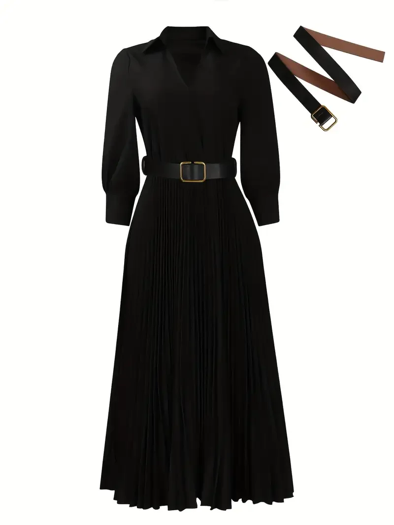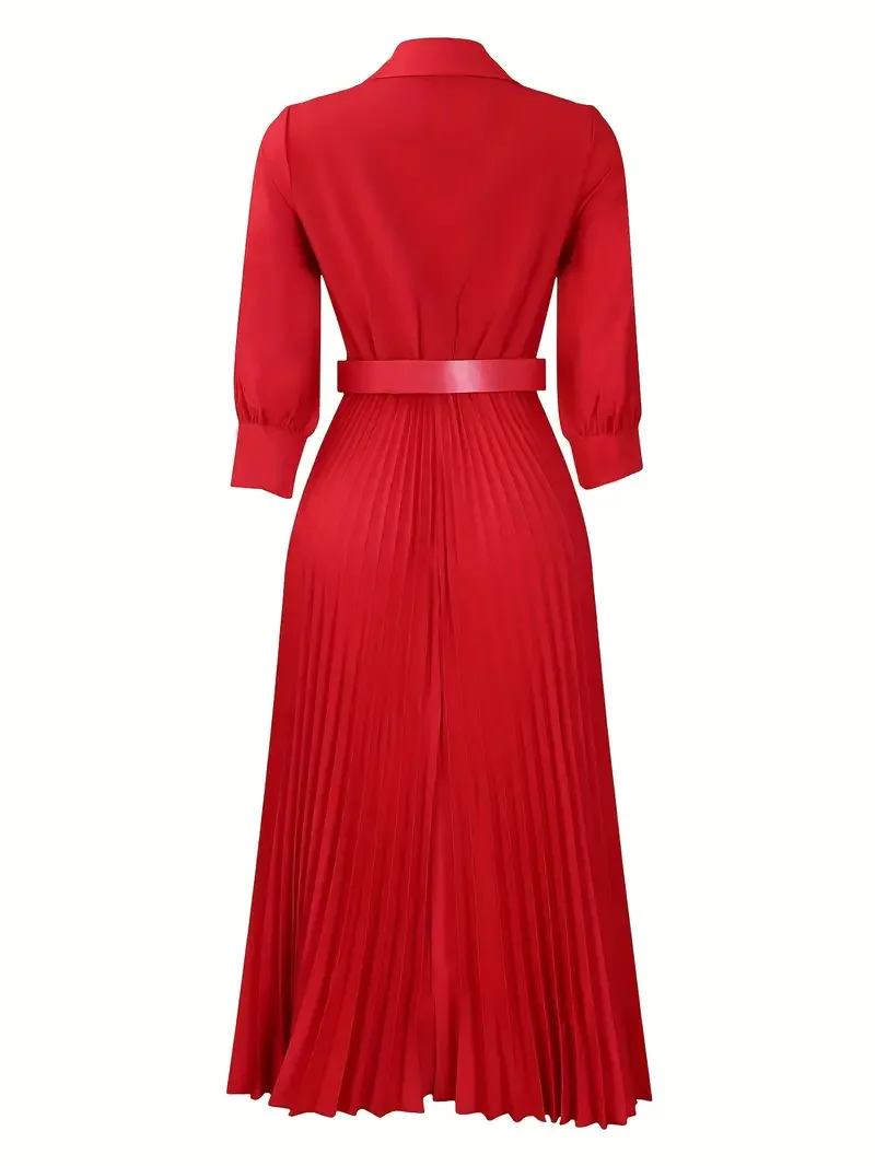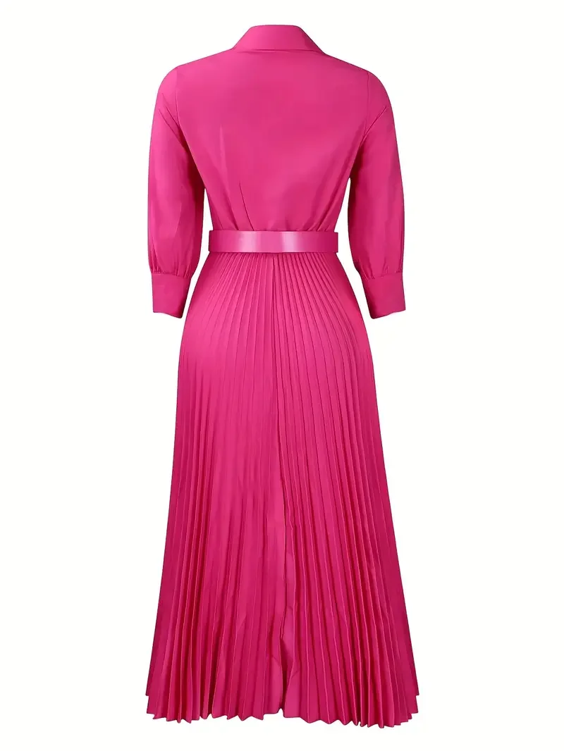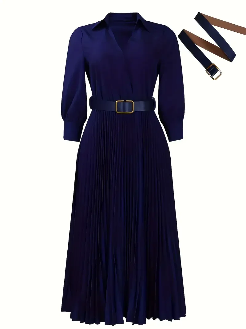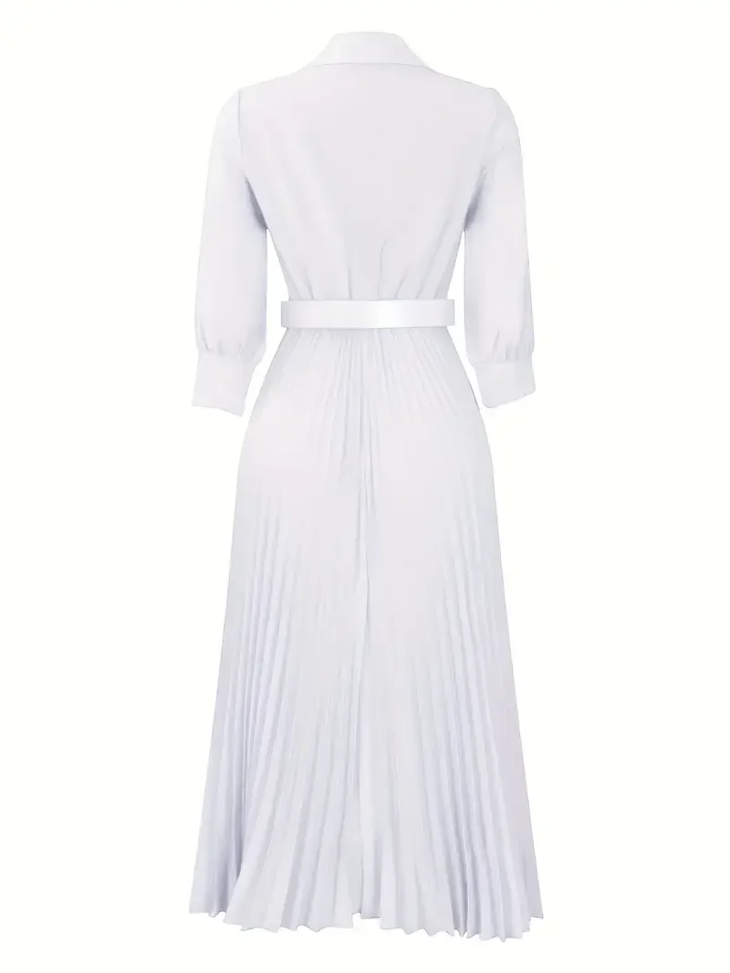 Elegant Pleated Maxi Dress for Office Women with Lapel and Long Sleeves for Casual Wear